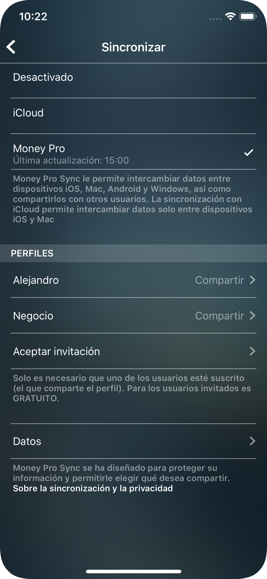 1. Vaya a Más > Sincronizar (Mac: Menú principal > Money Tracker > Preferencias > Sincronizar; Windows: Menú principal > Archivo > Preferencias > Sincronizar) y pulse Compartir junto al nombre del perfil (el que desea compartir)
